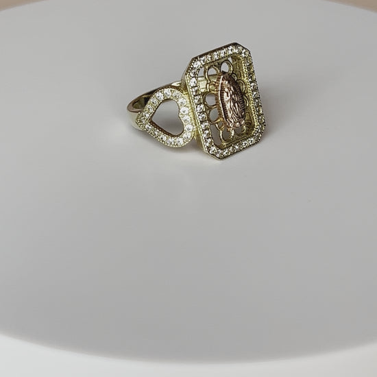 Show your devotion to the Virgencita with this exquisite 10k Rose Gold and Yellow Ring. Delicate and divine, this Virgencita Ring features a majestic centerpiece surrounded by 2 sparkling hearts. Perfect for honoring divine love, your faith, and your devotion. Truly a beautiful and meaningful token.